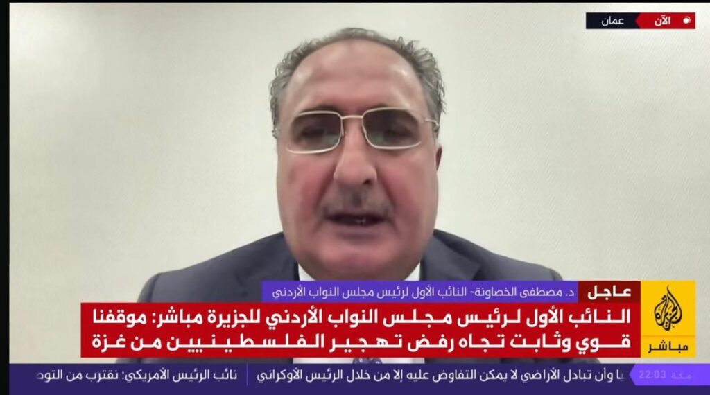 وأشار الى لقاء التاريخي لجلالة الملك عبد الله بالرئيس الأمريكي ترامب الذي أثناه عن تبني فكرة التهجير وانه من حق الشعب الفلسطيني العيش بسلام .