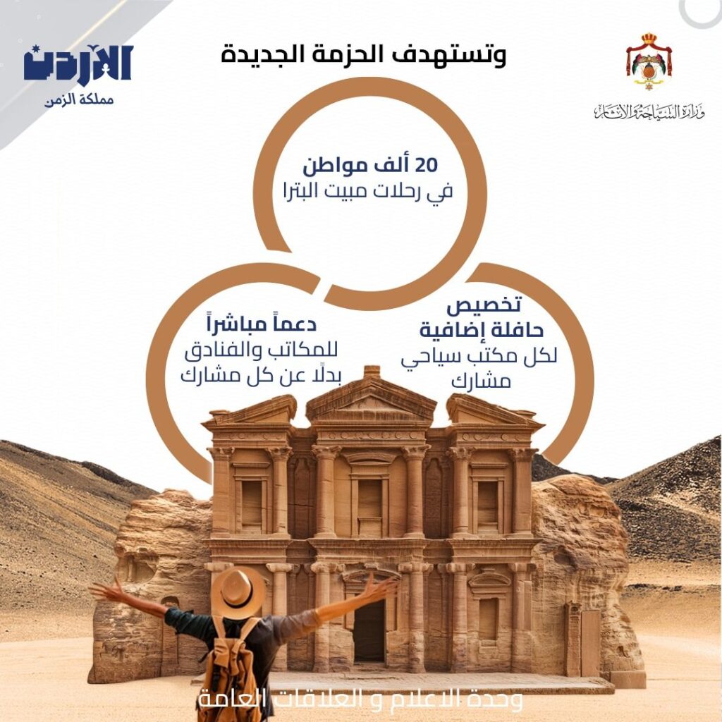 وتستهدف الحزمة الجديدة مشاركة ما يقارب 20 ألف مواطن في رحلات مبيت البترا، وتخصيص حافلة إضافية لكل مكتب سياحي مشارك في البرنامج، تتوجه إلى مدينة البترا، كما قدمت وزارة السياحة دعماً مباشراً للمكاتب السياحية والفنادق بدلًا عن كل مشارك في هذا البرنامج، ما يسهم في دعم الاقتصاد المحلي وتنشيط الحركة السياحية في مدينة البترا التي تُعد من أبرز الوجهات السياحية في المملكة.